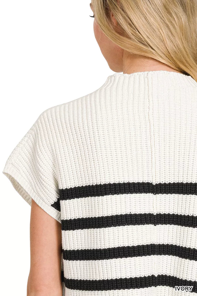 This short sleeve stripe sweater combines classic stripes with a modern silhouette for a timeless yet trendy look. The short sleeves make it perfect for transitional weather or layering. Crafted from a comfortable knit fabric, this sweater offers both style and comfort. The stripes add a touch of sophistication and versatility to the piece. Elevate your wardrobe with this chic and stylish short sleeve sweater that is perfect for various occasions.