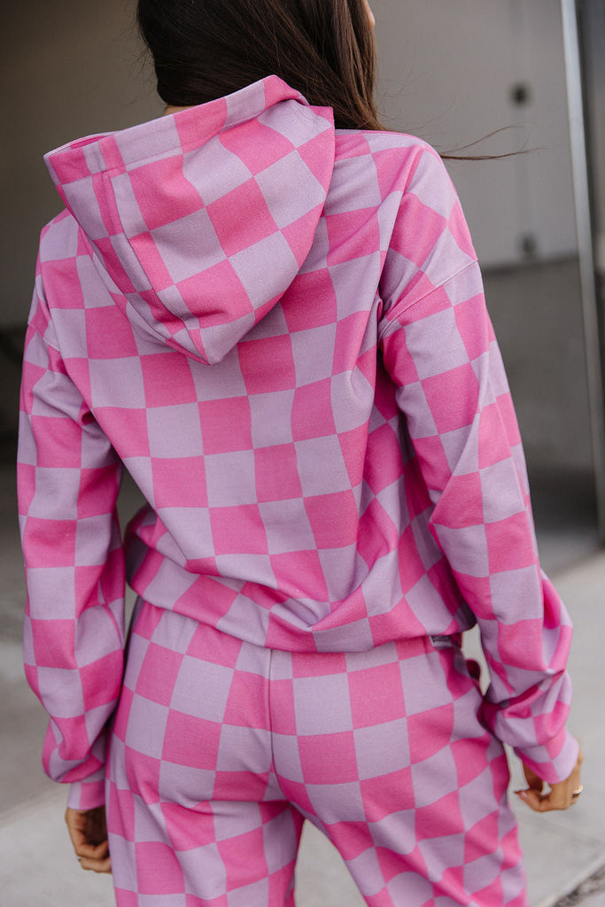 Cute, comfy, and totally checkered. This hoodie adds a fun pop to any outfit with its bold print and cozy feel. Perfect for throw-on-and-go days, chill hangs, and everything in between. Match with the matching joggers for the perfect fit!