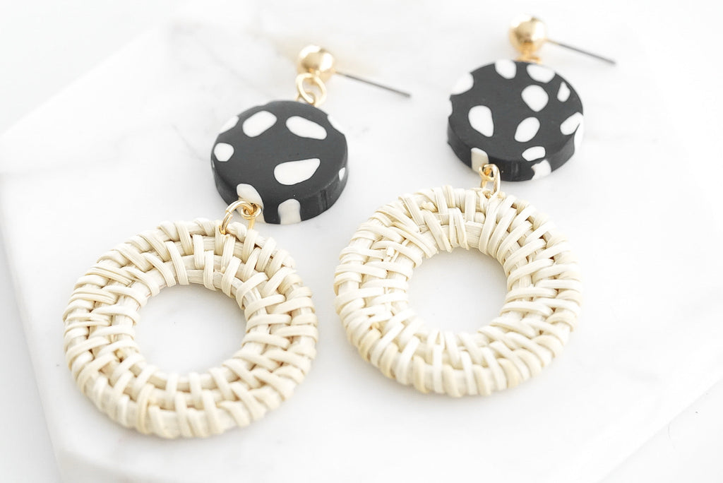 Gold And Black Bamboo Clay Polka Dot Rafia Straw Stud Tiered Woven Featherweight Hypoallergenic Nickel Free Statement Drop Earrings. Custom Straw Geometric Shapes Accents And Designed With Love In Texas. Size 2.75 Inch Length x 1.25 Inch Width With Custom Sizing Available On Select Pieces.