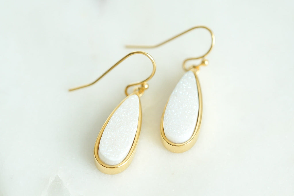 Gold And White Hypoallergenic Nickel Free Dainty Drop Earrings. Custom Druzy Raw Natural Quartz Stone Accents And Designed With Love In Texas. Size 1 Inch Length x 0.25 Inches Width With Custom Sizing Available On Select Pieces.