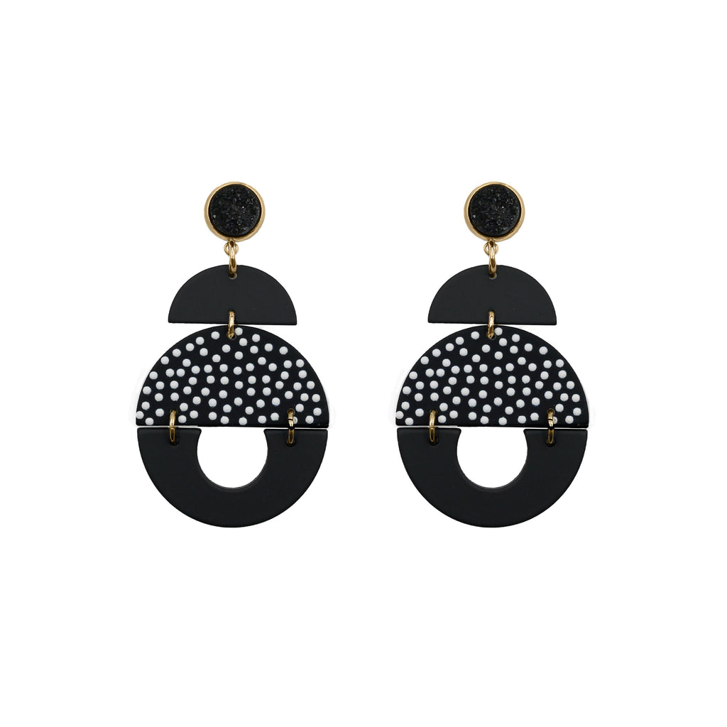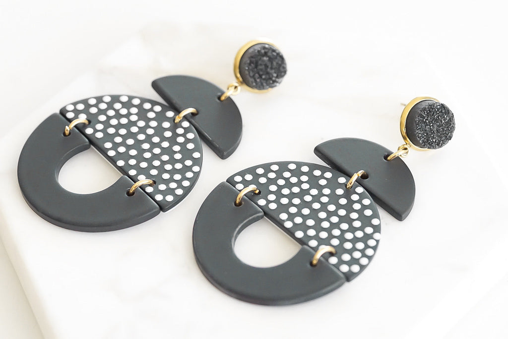 Gold And Black Clay Druzy Natural Stone Polka Dot Raw Stud Tiered Lightweight Hypoallergenic Nickel Free Statement Drop Earrings. Custom Druzy Raw Natural Quartz Stone Accents And Designed With Love In Texas. Size 2.75 Inch Length x 1.5 Inch Width With Custom Sizing Available On Select Pieces.