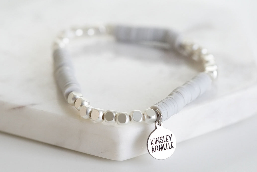 Silver And Gray Disc Heishi Station Hypoallergenic Nickel Free Beaded Stretch Bracelet. Custom Decorative Accent Beads Accents And Designed With Love In Texas. Size Small, Medium, Large, and Extra Large Ranging From 6.25 - 7.25 Inch Circumference With Custom Sizing Available On Select Pieces.