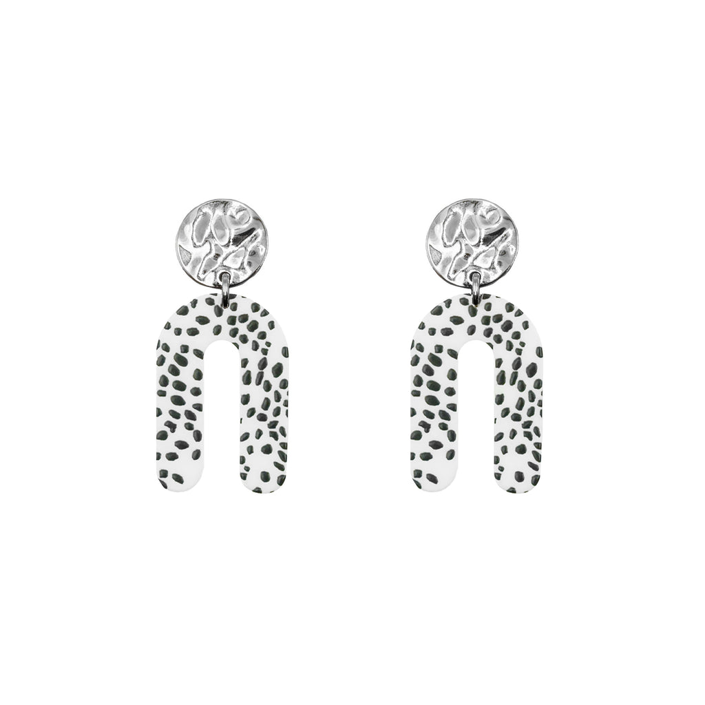Silver And White Arch Dalmatian Disc Dotted Hammered Stud Hypoallergenic Nickel Free Drop Earrings. Custom Lucite Acrylic Geometric Shapes Accents And Designed With Love In Texas. Size 1.75 Inches Long x .75 Inches Wide With Custom Sizing Available On Select Pieces.