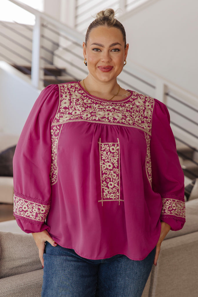 Our Rodeo Queen Embroidered Blouse is lightweight and airy, perfect for the upcoming season. The cream-colored floral embroidery makes a feminine statement, giving this piece an elegant and timeless look, while the round neckline and cased elastic sleeve cuffs complete the look.